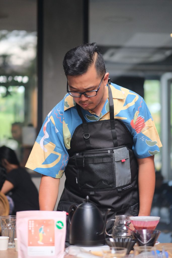 Mangun Edwin meracik biji kopi yang dibawanya dari Bandung (Jum, 10/06/22)