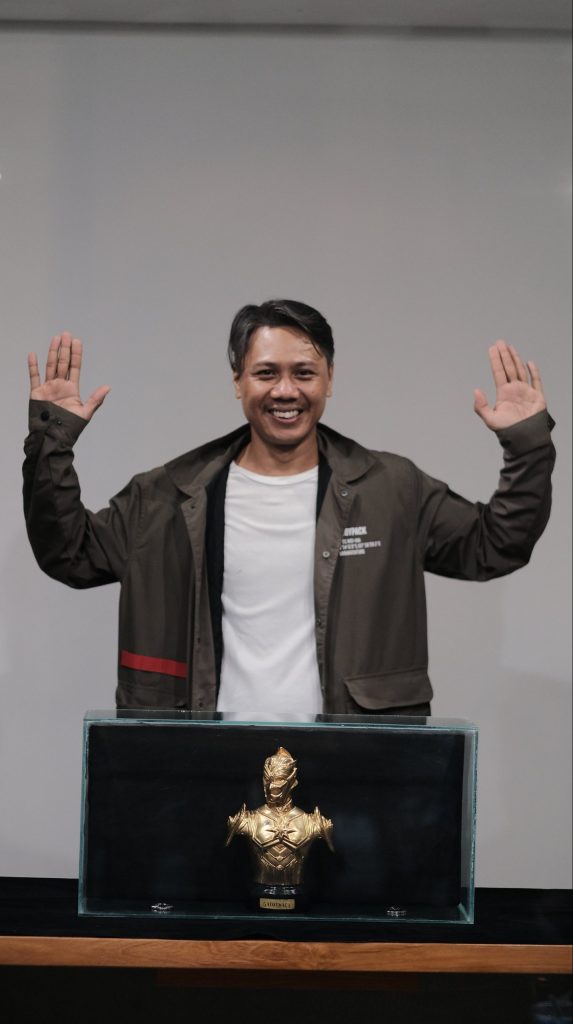 Wilman Hermana bersama patung Gatotkaca untuk film laga Jagad Satria Dewa: Gatotkaca (Bramantyo, 2022)